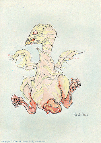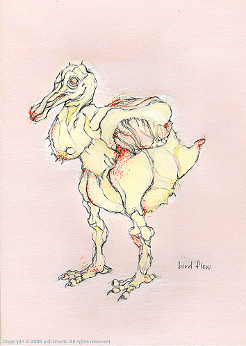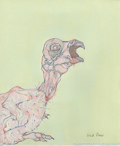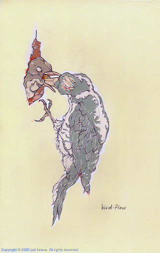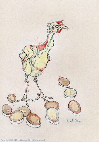 Around Thanksgiving of 2005, news coverage of the avian flu began converging with images and talk of Thanksgiving turkeys. Televised images of the mass extermination of diseased birds followed shots of turkeys in clipped-wing flocks, running directionless patterns around farm yards, and the obvious connections were made; people began asking whether it was safe to eat the turkeys. Was there really cause for alarm, or did the quantity of turkeys up for the slaughter merely remind people of the mounds of bird carcasses being pushed into mass graves on TV? With sensationalized news covering the break-ups and pregnancies of celebrities in equal proportion to the bird flu, the distinction was (and is) difficult to make. In either case the varnish spread thin and it was clear for the moment that familiar, sentimentalized holiday visions - families gathering around a beautiful, well-cooked bird, the president cutely pardoning a turkey in a bow tie - are fairly optimistic portrayals of what goes on, bird-wise, around Thanksgiving. Suddenly people were seeing the turkey as a bird that might carry the flu.