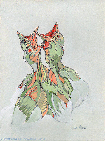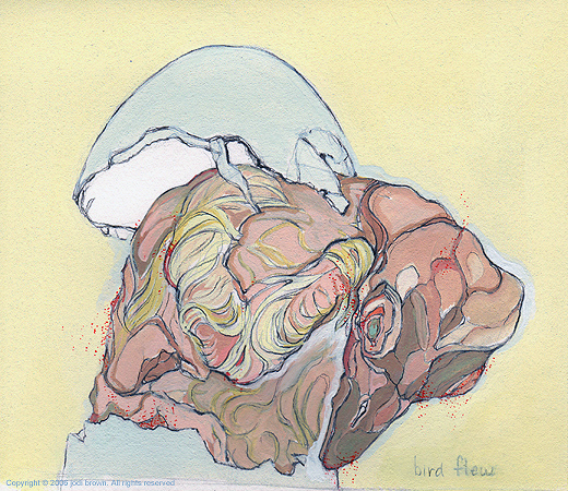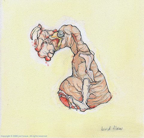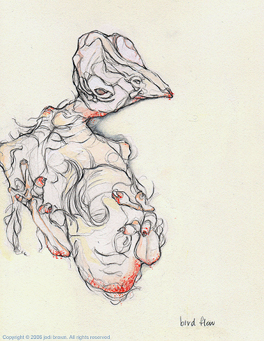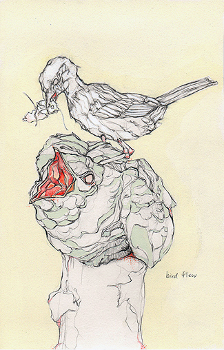 The birds are drawn in pencil, topographical line weaving over and under paint, drawing out shapes that break the birds apart while unifying form. Clouds of red dots swim around centers of disease transmission - scaled legs and feet, beaks, claws, anuses, and mouths. Distorted, grotesque and, at times, darkly humorous, “Bird Flew” offers an alternate perception of birds.