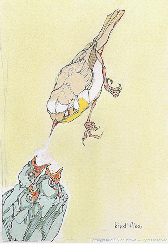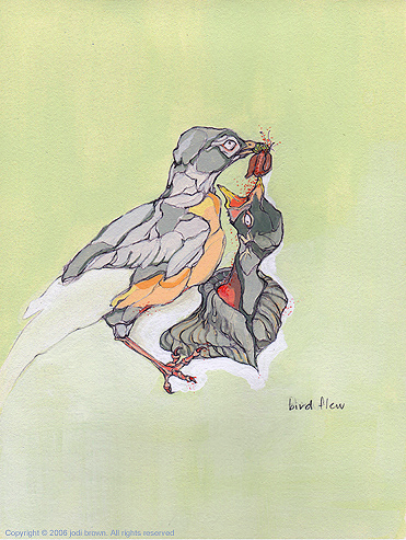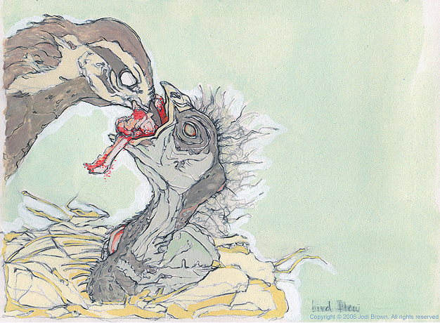 With baby birds as the subjects – blind, insatiable and raw - “Bird Flew” suggests a metaphor for our own insatiable appetites (for food, products, news, and more). The stuffing of regurgitated food and partially digested insects down the throats of baby birds recalls “stuffing” as a staple of the Thanksgiving meal - where you eat until you’re “stuffed”- and the psychology of a culture that results in the advent of such tributes to excess as the “stuffed crust pizza”.
